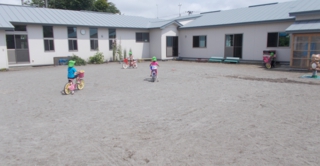 ②広い園庭 ひかり保育園、自慢の園庭です。登り棒や鉄棒での逆上がりなどに挑戦。雪がなくなれば、自転車に乗って遊びます。